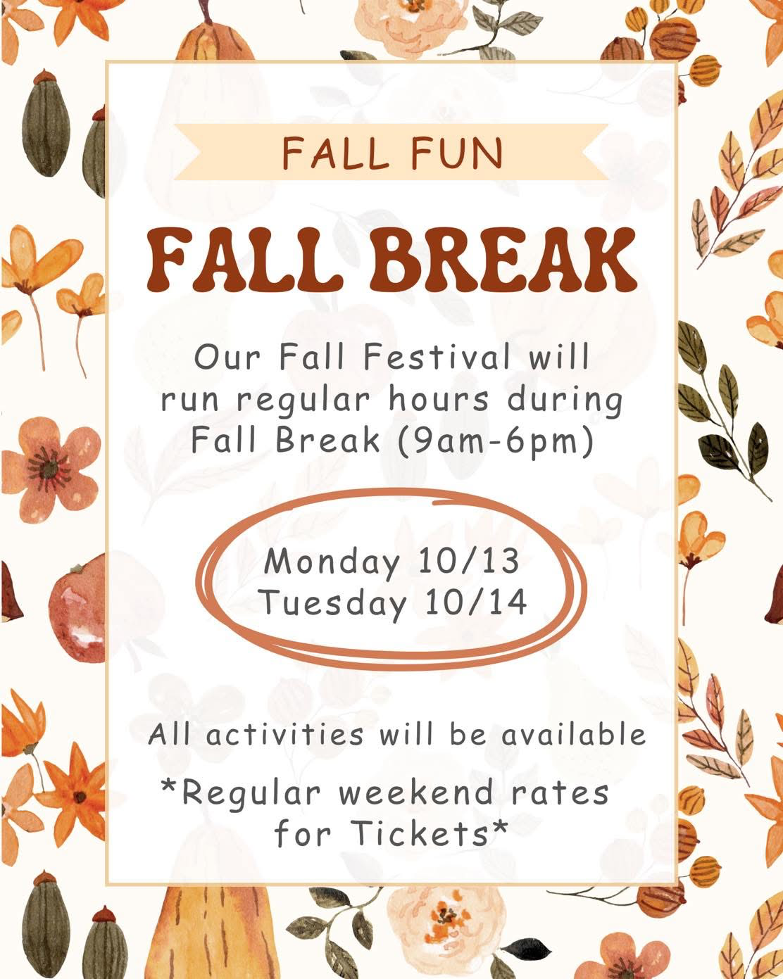 • Payment: cash and card accepted; buy tickets at the gate during Fall Break hours.