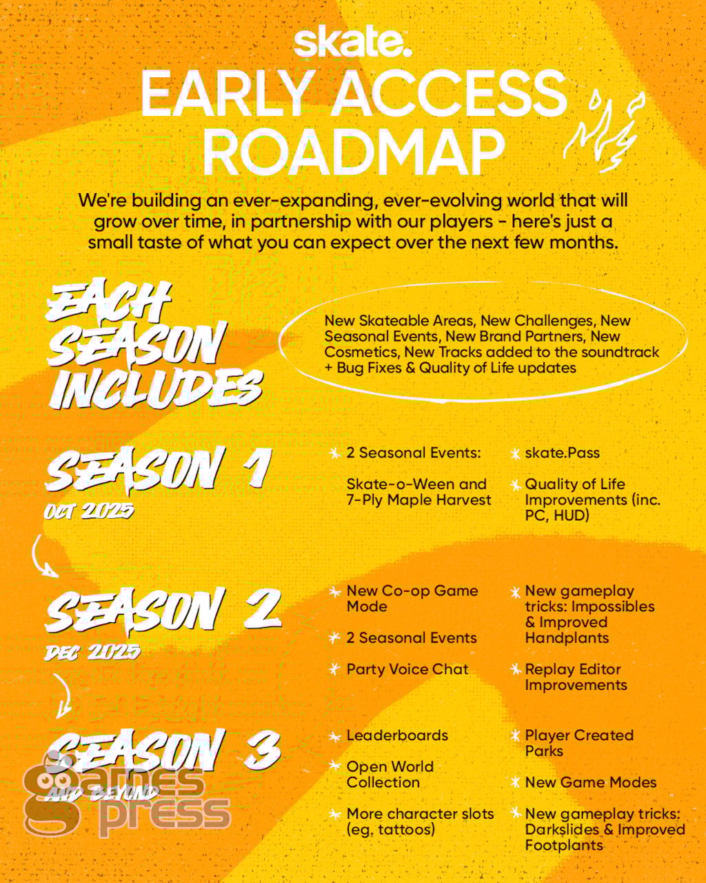 • Season 1 preview including seasonal events, new skateable areas, brand partners, soundtrack additions, and quality of life fixes.