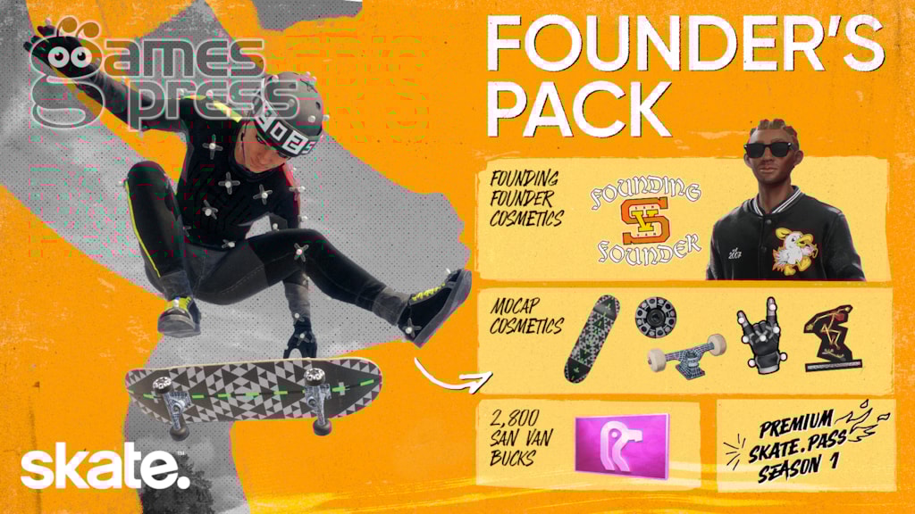 The Founders Packs are optional, limited-time bundles that give early supporters strong value and exclusive flair: the Founder’s Pack is $24.99 includes 2,800 San Van Bucks, MoCap cosmetics, exclusive Founding Founder cosmetics, and the Premium skate.