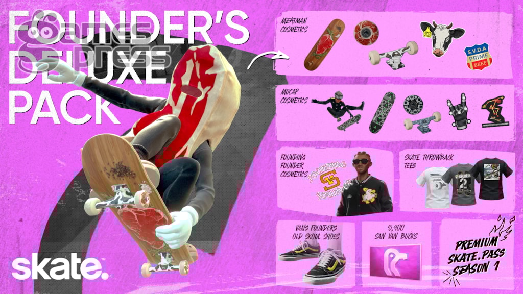 Pass for Season 1, while the Founder’s Deluxe Pack is $49.99 adds an extra 3,100 San Van Bucks (5,900 SVB total), Meatman cosmetics, Vans Founders Old Skool shoes, and throwback tees from Skate 1, 2, and 3.